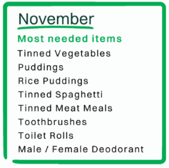 Tinned Vegetables; Puddings; Rice Puddings; Tinned Spaghetti; Tinned Meat Meals; Toothbrushes; Toilet Rolls; Nappies (Size 5 + above); Male / Female Deodorant